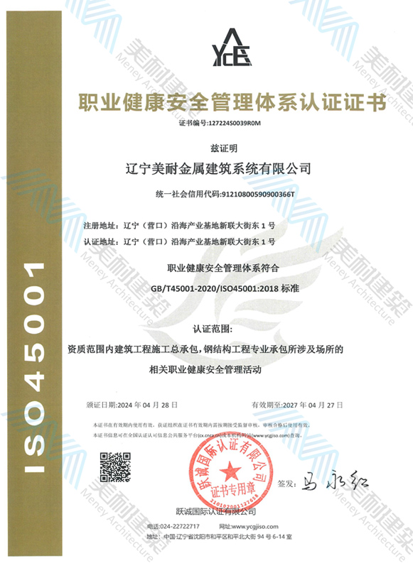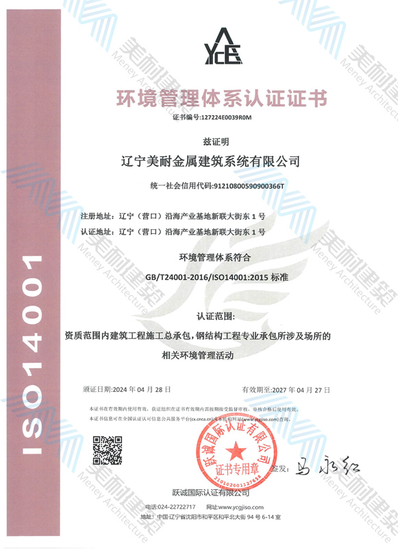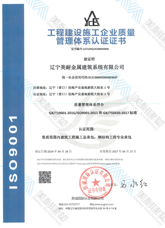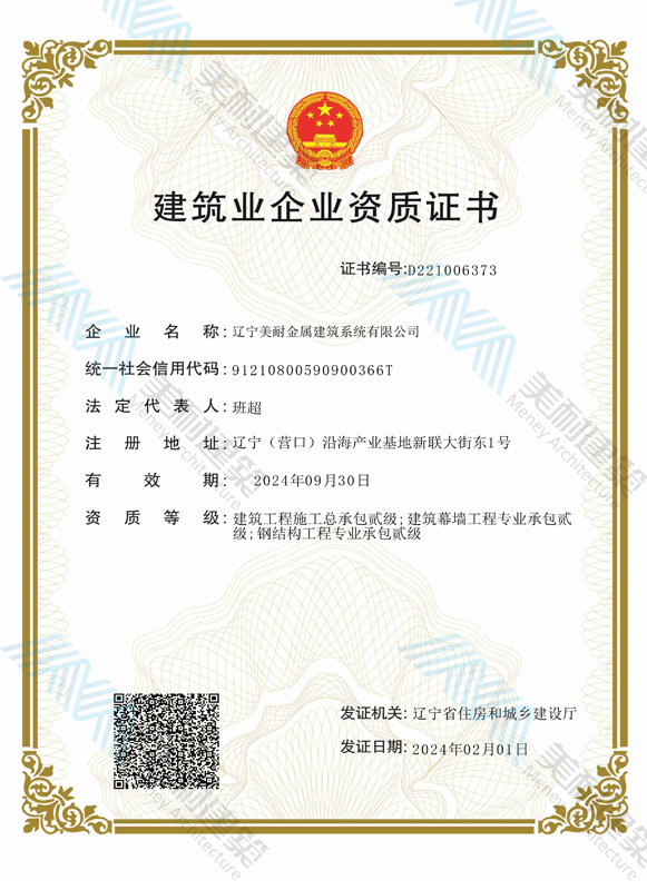 遼寧美耐金屬建筑系統(tǒng)有限公司位于遼寧(營口)沿海產(chǎn)業(yè)基地,專注于預制金屬建筑系統(tǒng)領(lǐng)域,是一家集工業(yè)建筑設(shè)計、制作、施工及相關(guān)的技術(shù)咨詢與服務(wù)為一體的綜合性服務(wù)企業(yè)。作為國家鋼結(jié)構(gòu)協(xié)會會員、中國建筑金屬結(jié)構(gòu)協(xié)會會員單位與國家高新技術(shù)企業(yè),美耐建筑集建筑工程施工總承包、鋼結(jié)構(gòu)工程專業(yè)承包等多種資質(zhì)于一身,并擁有22項鋼結(jié)構(gòu)建筑領(lǐng)域?qū)@?項軟件著作權(quán)。